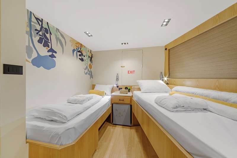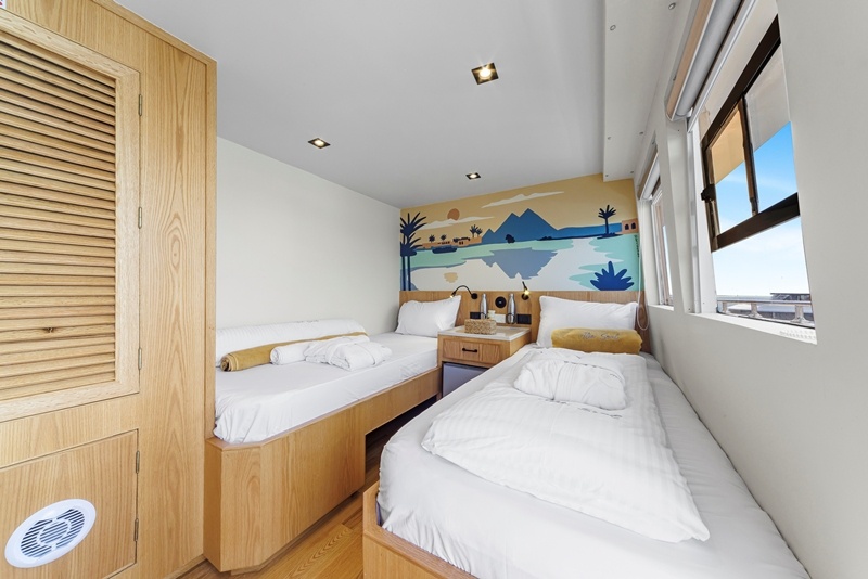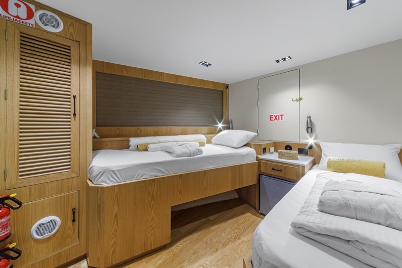 Jede Kabine misst 10 Quadratmeter, hat eine selbst-regelbare Klimaanlage und ist individuell gestaltet. Alle sind mit Bullaugen ausgestattet, die geöffnet werden können. Die Kabinen verfügen je über ihr eigenes, modernes und geräumiges Badezimmer mit Dusche und WC. Jeder Gast erhält ein großes und ein kleines Handtuch sowie einen Bademantel.
