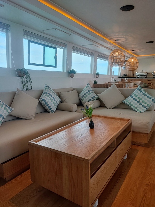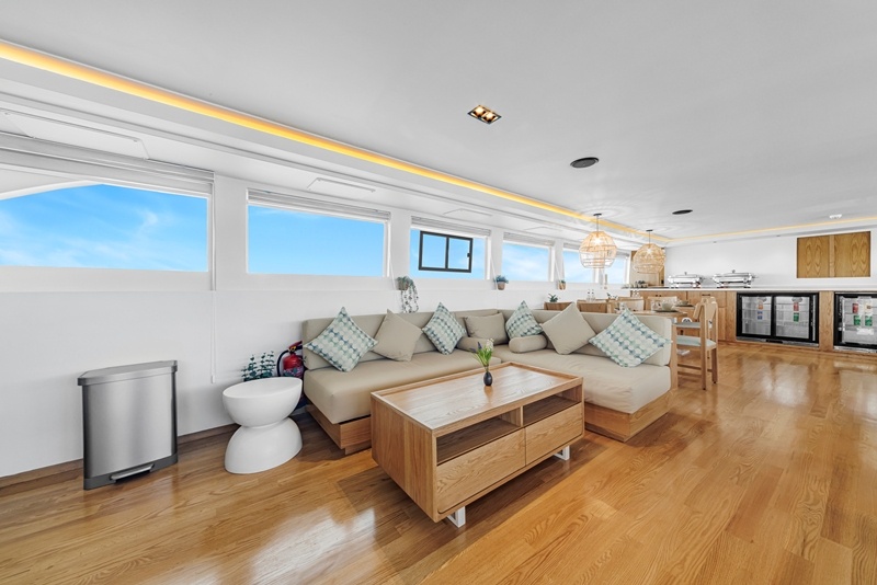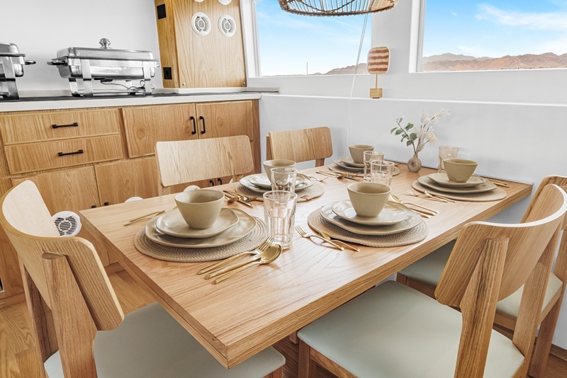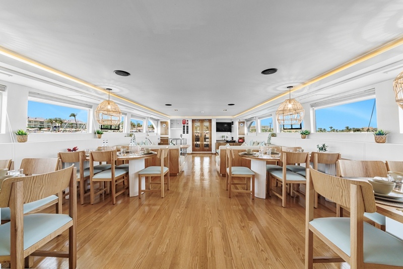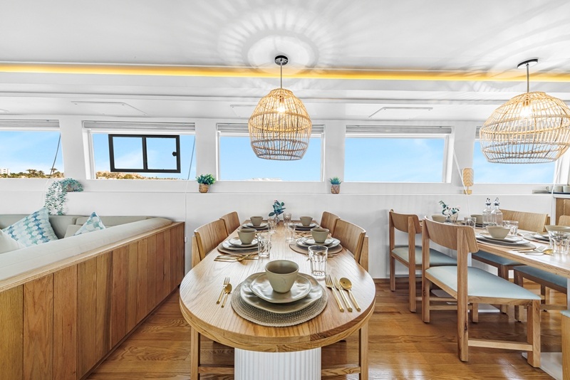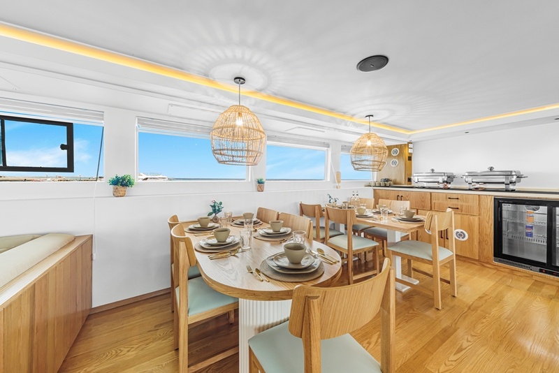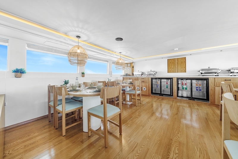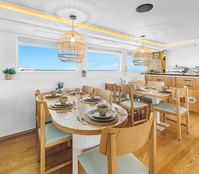 Auf dem Hauptdeck findet ihr die Kabinen der Crew, die Bordküche und der elegante Restaurant- Saloon-Bereich mit viel hellem Holz und gemütlichen Sitzgelegenheiten.