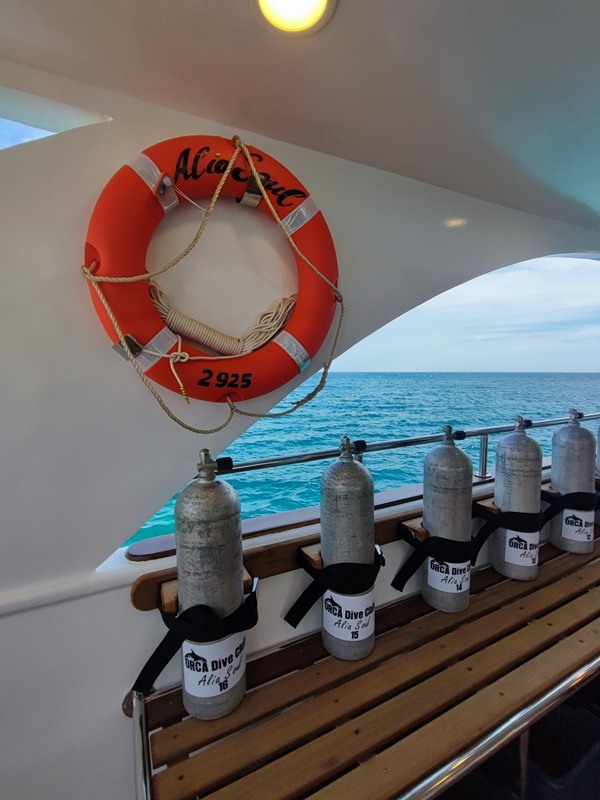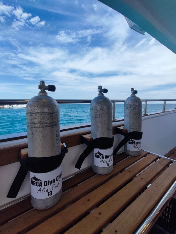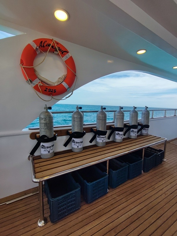 Um für ein Höchstmaß an Sicherheit zu sorgen, ist die Alia Soul mit ENOS ausgestattet. Getaucht wird mit 12 Liter Alu-Tanks, 15 Liter stehen gegen Gebühr zur Verfügung. Wenn ihr nicht von der Tauchplattform startet, bringen euch die zwei Zodiacs zu den Tauchspots.