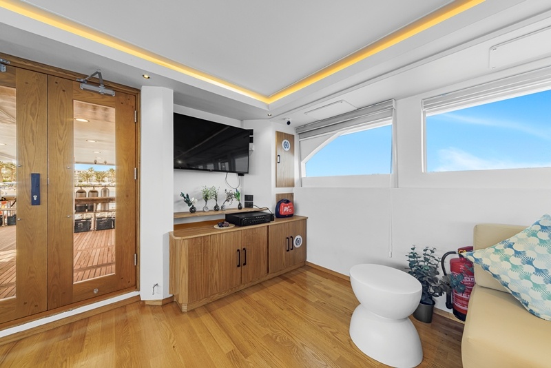 Das Oberdeck besteht aus der Brücke, 2 Twin- und 2 Doppelbett-Kabinen sowie einem überdachten Sitzbereich mit Bar.