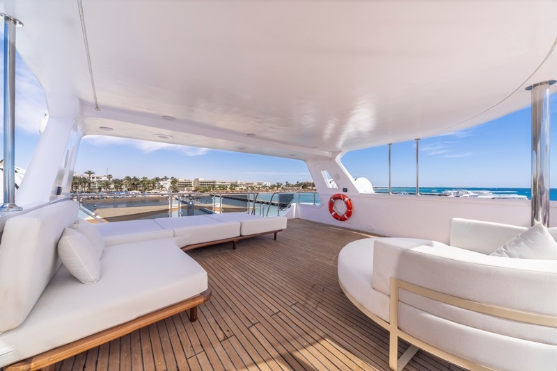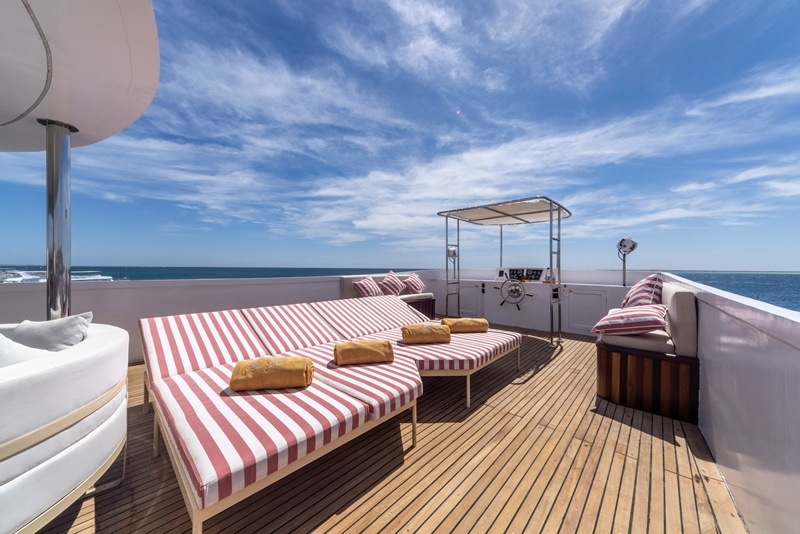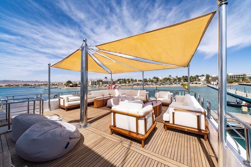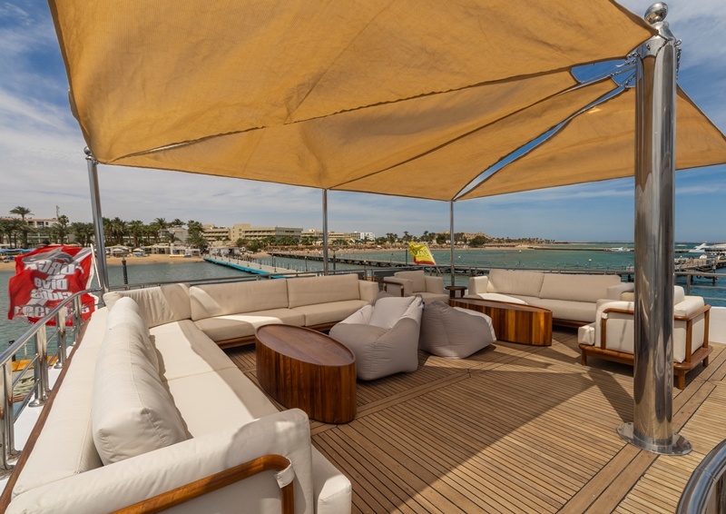 Die Sonnendecks bietet überdachte Bereiche mit Sesseln und Sofas, und einen unüberdachten mit Sonnenbetten.
