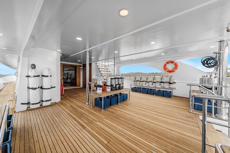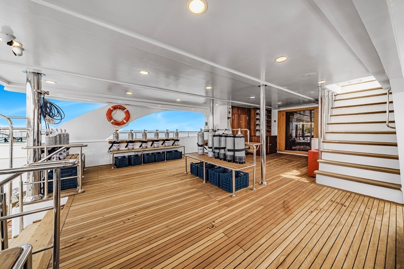 Am Heck liegt das Tauchdeck, welches eine große Tauchplattform, einen großzügigen Bereich zum Auf- und Abrüsten, einen Raum zum Lagern und Laden sowie zwei Badezimmer mit WC und Dusche bietet.