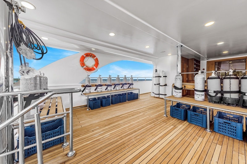 Wie oben bereits erwähnt liegt das Tauchdeck, welches sehr geräumig ist, am Heck des Hauptdecks. Es bietet eine große Tauchplattform, einen Raum zum Lagern und Laden sowie zwei Badezimmer mit WC und Dusche. Zudem hat hier jeder Taucher Platz zum An- und Abrüsten, seine Tauchflasche, einen Sitzplatz und eine Kiste zum Verstauen der persönlichen Ausrüstung.