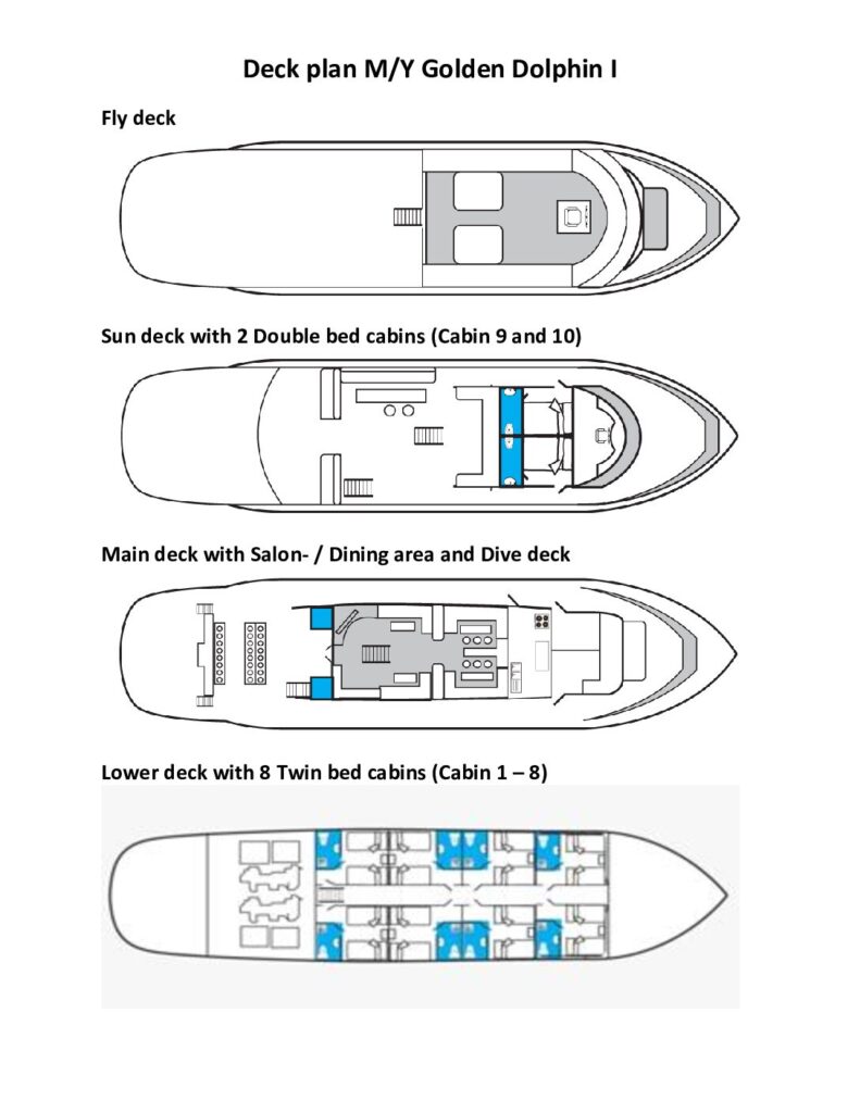 Die Golden Dolphin 1 verfügt über 10 Kabinen, in denen die maximal 20 Gäste Platz finden. Hierbei gibt es: