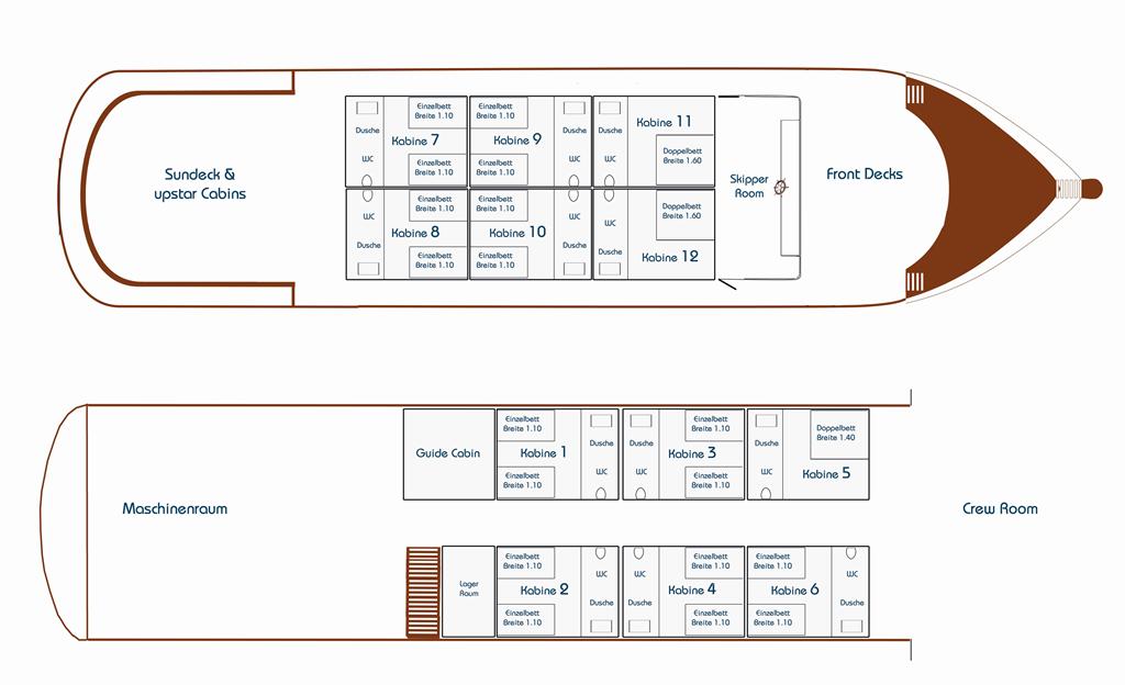- Auf dem Sonnendeck: 6 Kabinen (2 mit Twin-Betten & 2 mit Doppelbett)