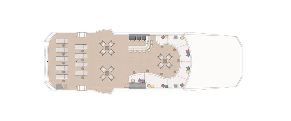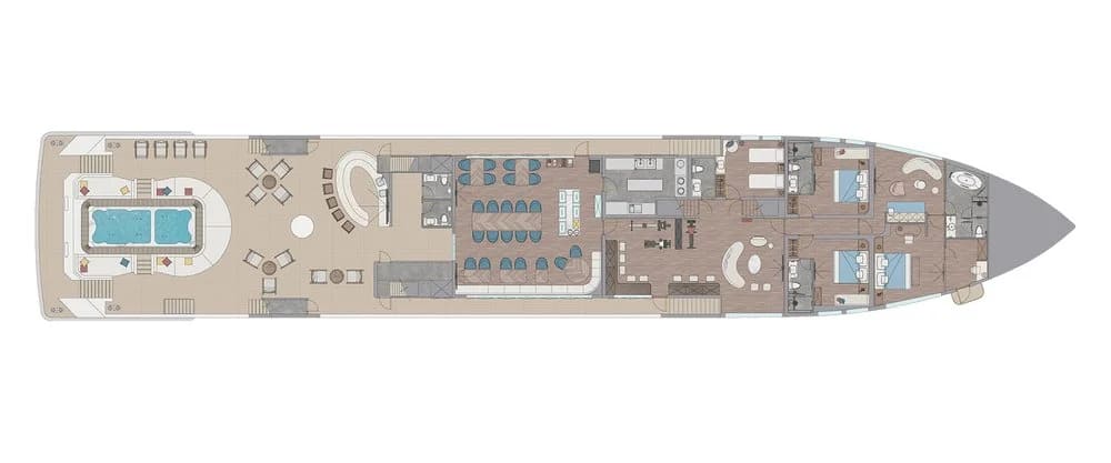 Das Hauptdeck bietet Pool, Whirlpool und Bar. Ebenso das Restaurant, die Küche, das Sportstudio, das Business Center, den Fernsehraum, die Family Suite und die Master Kabinen.