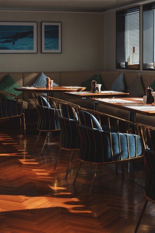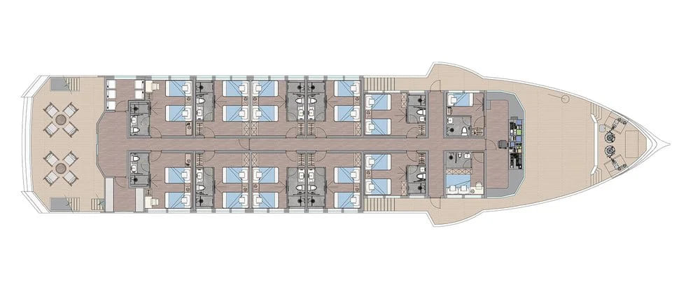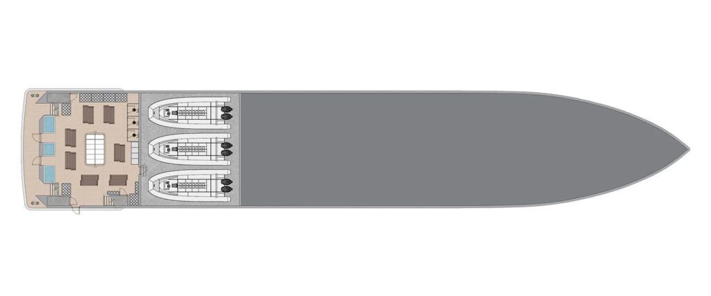 Auf dem Oberdeck gibt es einen Outdoor-Sitzbereich, die Deluxe Kabinen und das Steuerhaus.