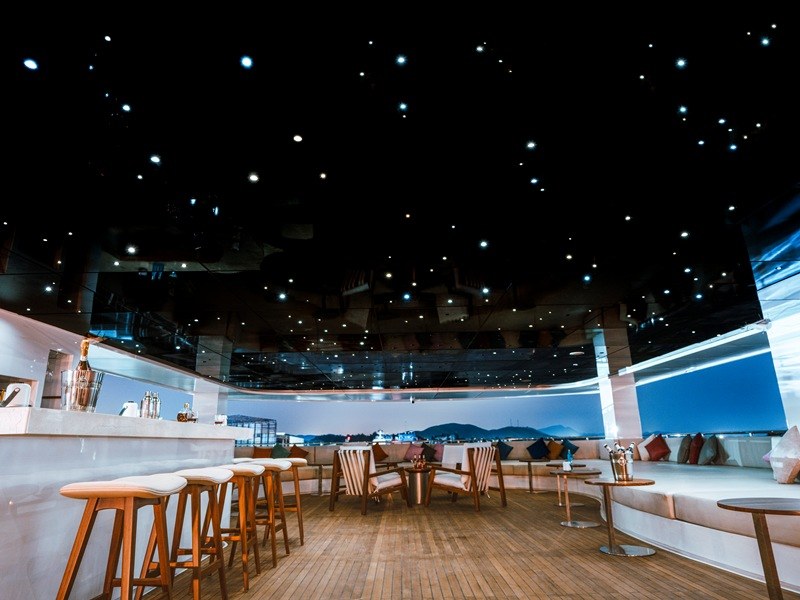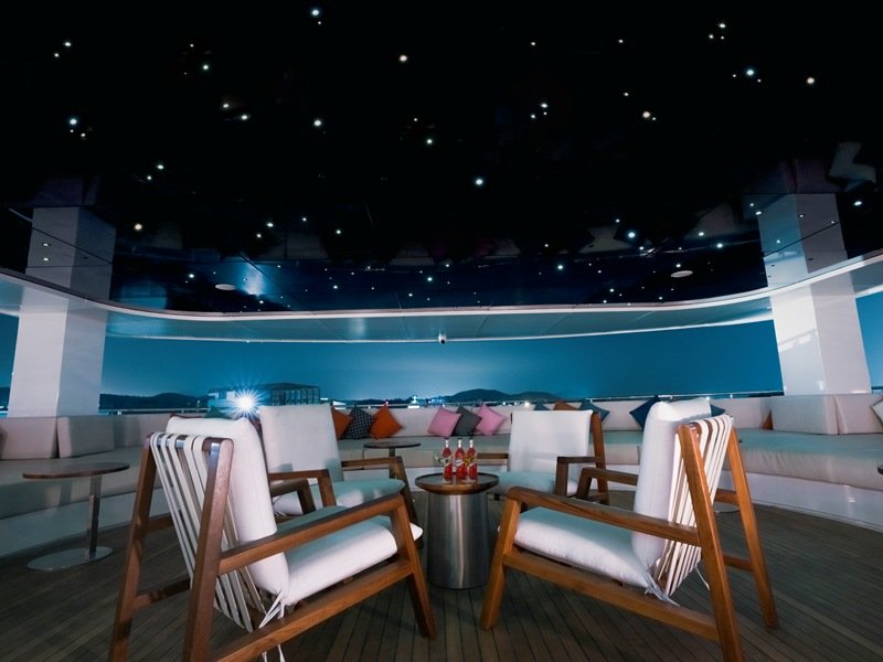 Ganz oben erwarten euch das Sonnendeck, eine Lounge, die Sky Lounge und eine Bar.