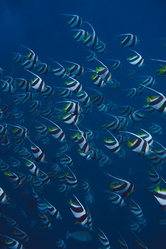 Schwarm Gemeiner Wimpelfische auf Tour mit der White Pearl