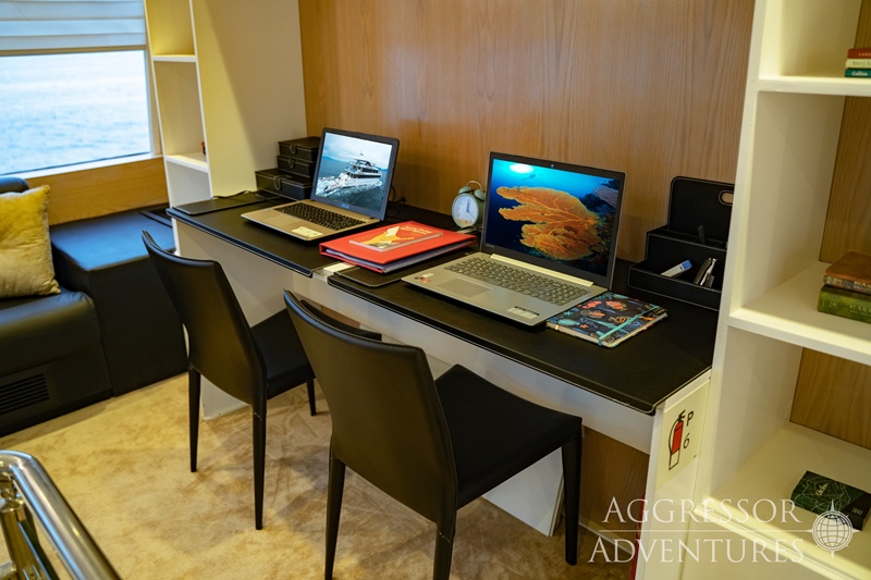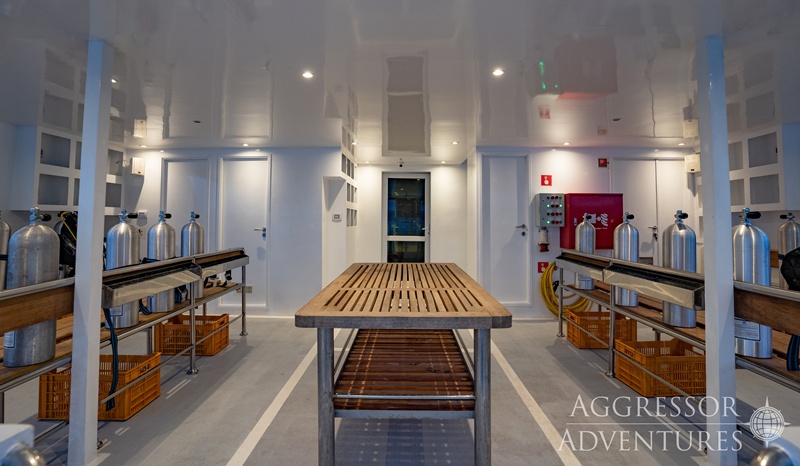 Auf dem Hauptdeck erwarten euch die beiden Zodiacs, das Tauchdeck, die Kombüse und das Restaurant. Am Bug befinden sich die Kabinen Nr. 6 bis 9.