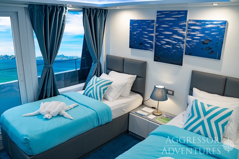 - Balcony Suiten Nr. 1 und Nr. 10 bis 13: King-Bett oder Twin-Betten, Panorama-Fenster, privater Balkon, Oberdeck